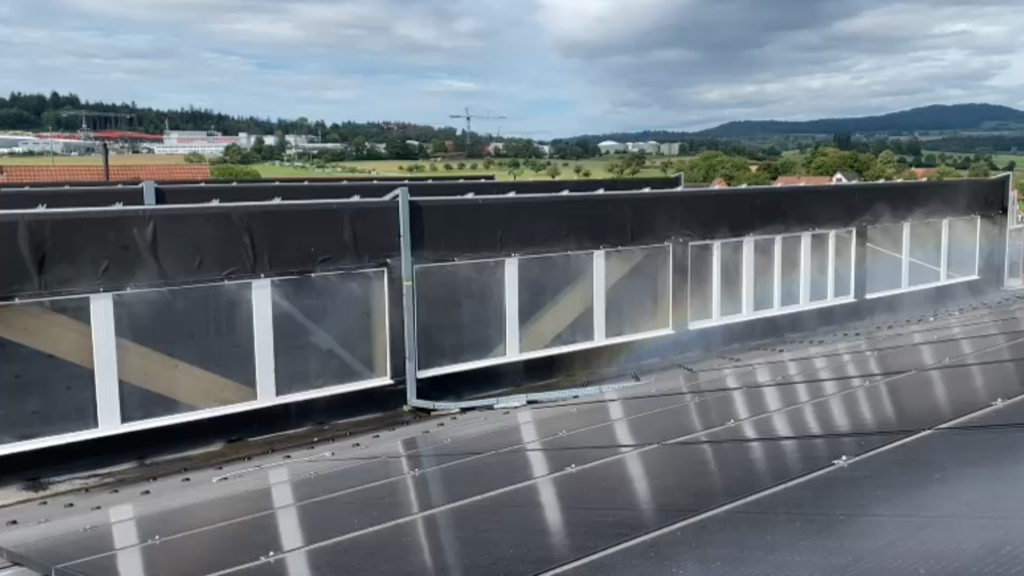 Aufrüstung des Dachs unseres Gebäudes mit einer Sprühnebel Kühlung. Zusammen mit unserer Wetterstation kontrollieren wir so während den heissen Sommermonaten unsere Gebäudetemperatur mit einem CO2 neutralen System, das ohne Energieverbrauch auskommt.